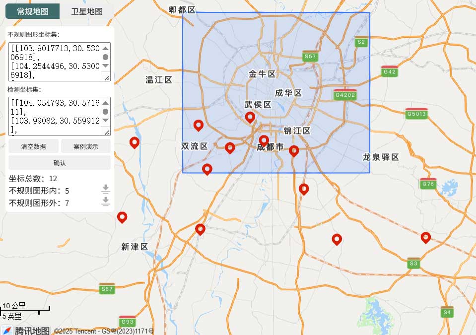 该检测工具仅支持简单不规则多边形和坐标点集合之间的关系,若不规则多边形过于复杂则可能会出现不正确数据。