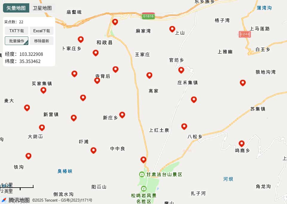 坐标点下载支持TXT格式和Excel格式两种,下载前需先确保有在地图上进行选点。